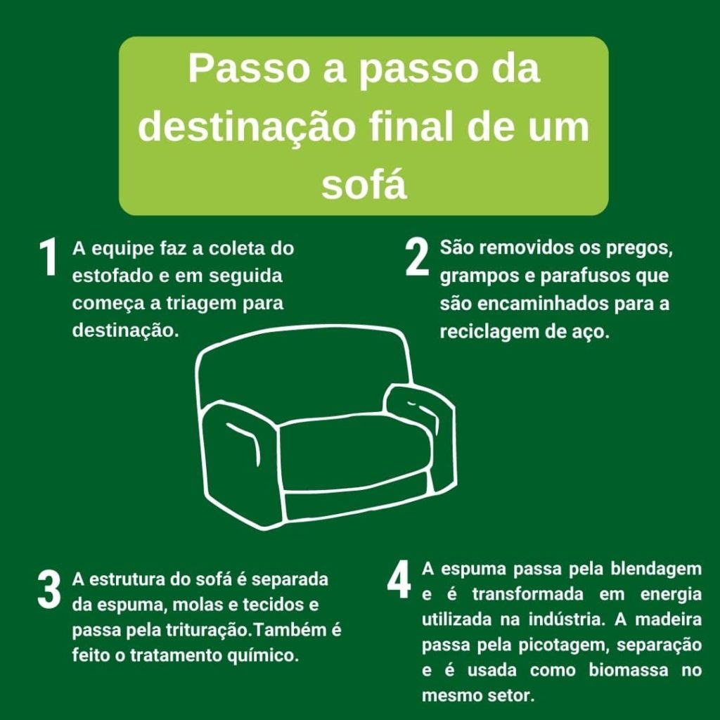 Por isso, o descarte ecológico de sofá é tão importante e necessário para que o estofado seja reaproveitado. No processo é feita a coleta, triagem, tratamento e avaliação do que pode ser reaproveitado, diminuindo o desperdício e contribuindo para a renovação da matéria-prima.