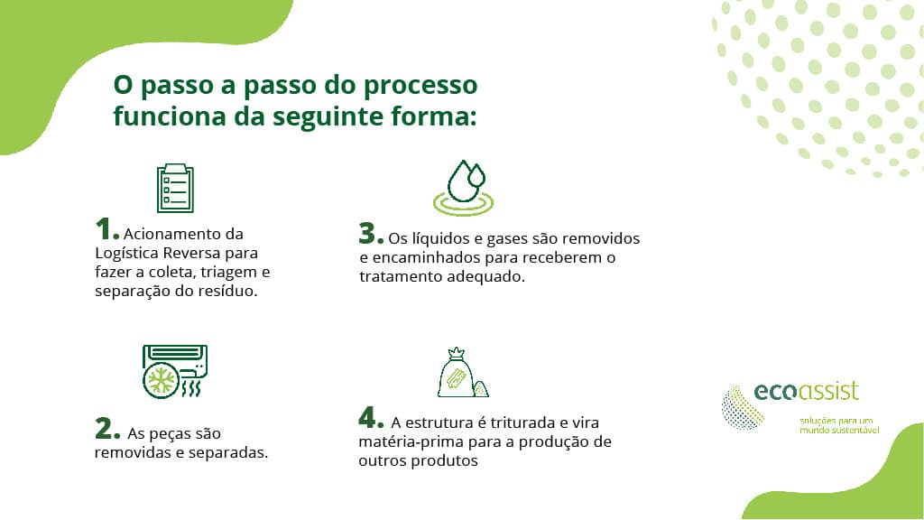 O processo de Logística Reversa ar-condicionado é composto por diversas etapas que garantem que o objeto será destinado de forma sustentável em todas as fases, desde a coleta, triagem e encaminhamento para a destinação final.